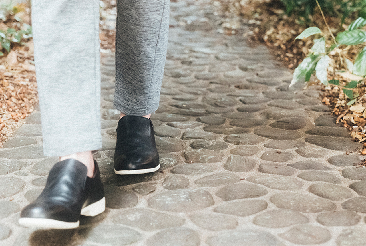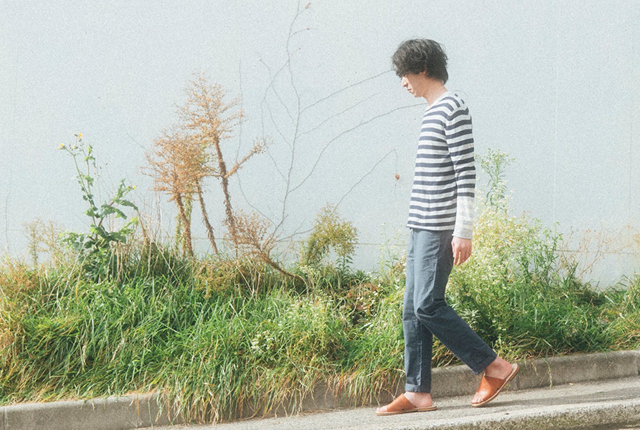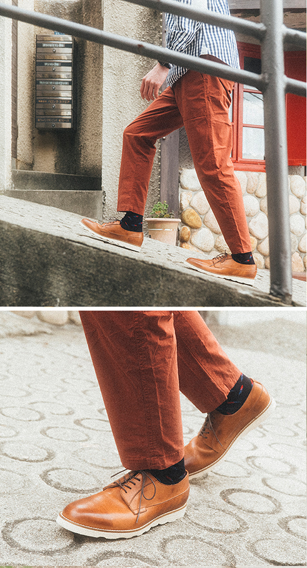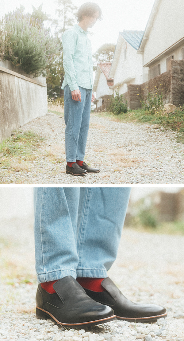 薄めのトーンの春らしいスタイリング。スリッポンの広めの履き口から覗くソックスの赤がしっかり効いてます。