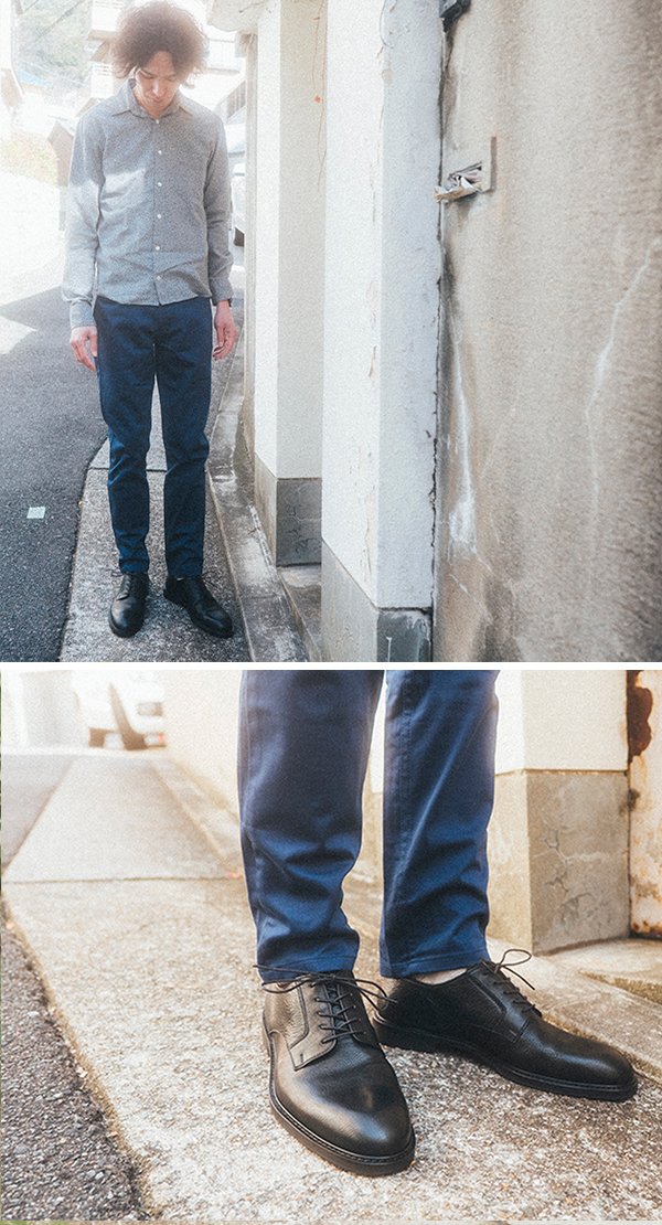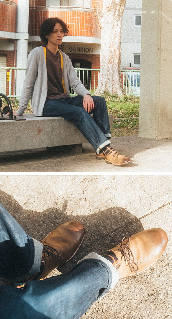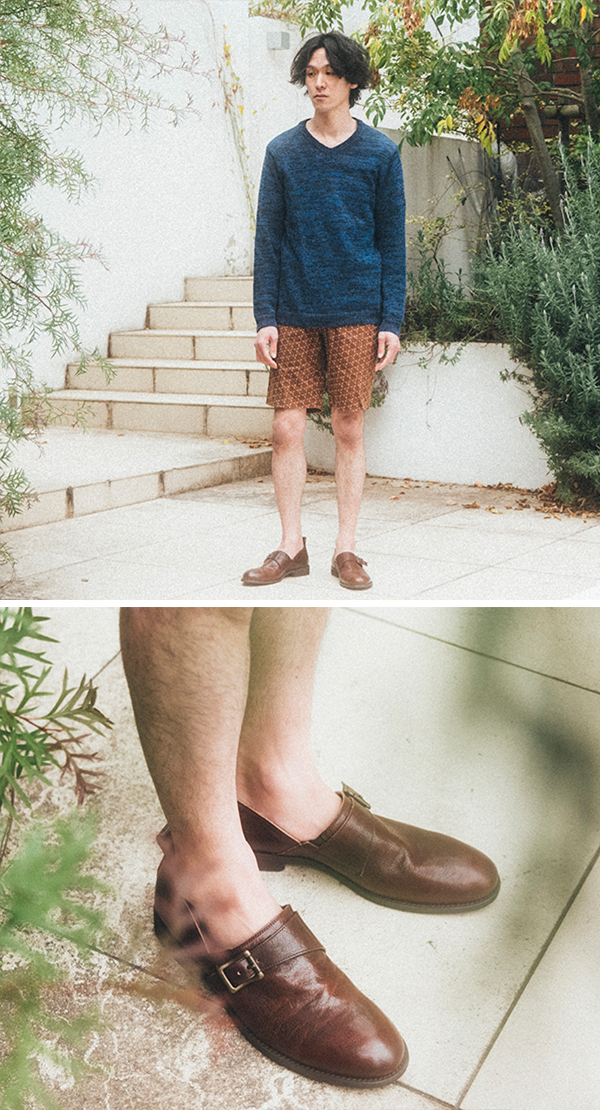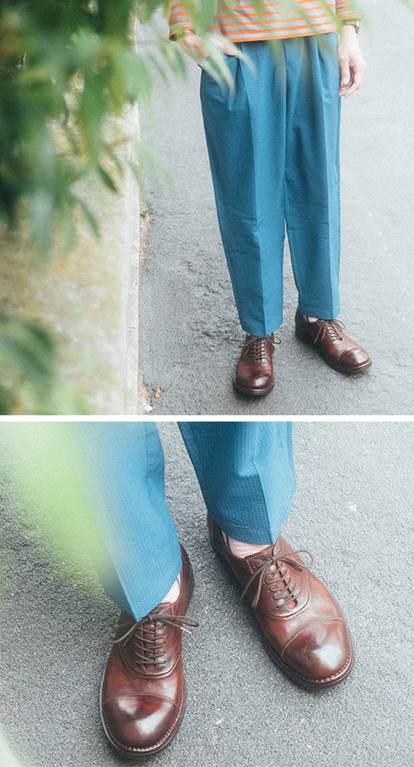 個性的なシルエットのパンツに、クセのあるパターンが特徴の本格派レザーシューズを合わせる。存在感抜群のコーディネート。