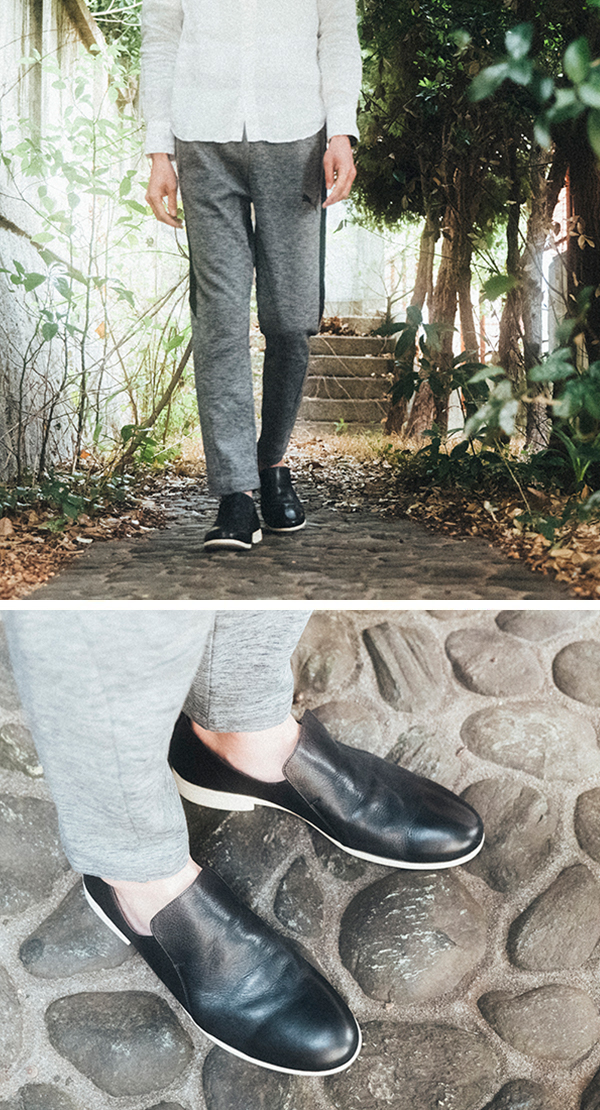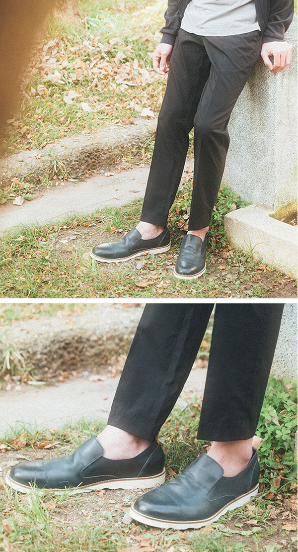 スポーティなボトムスに、キレイめ白シャツ。足元は爽やかにBLKのキレイめスリッポンを合わせる。