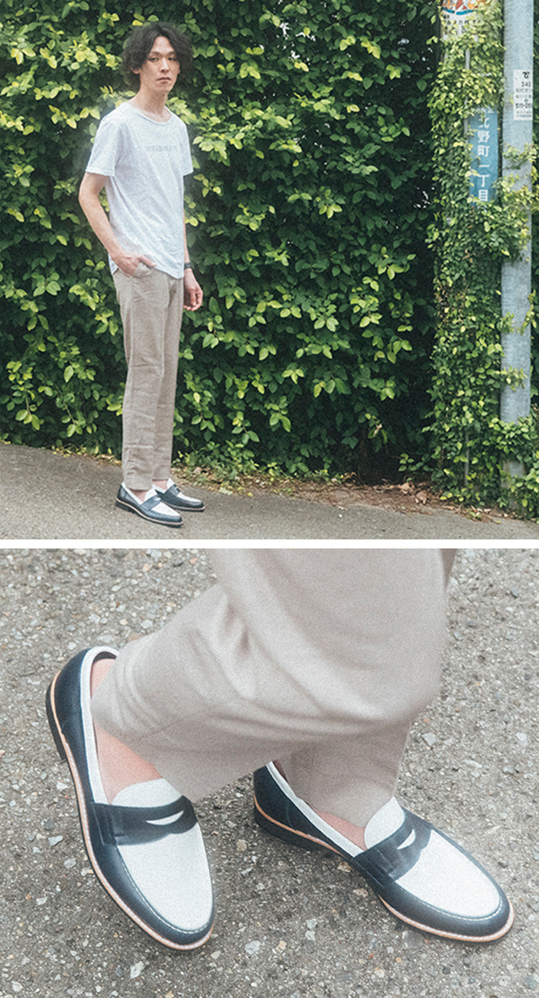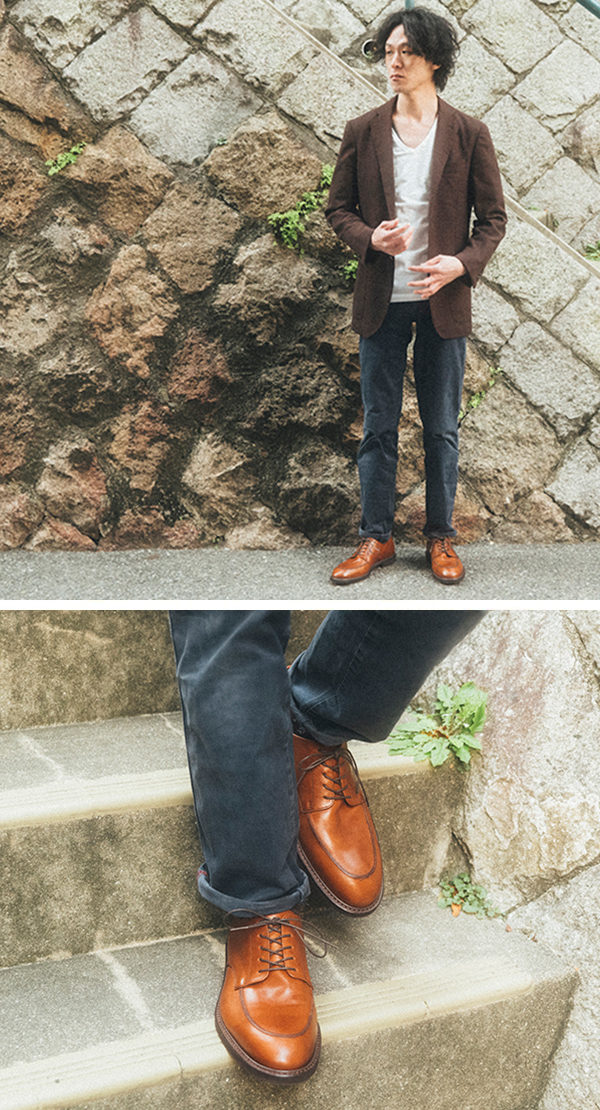 Tシャツ&ジャケットのラフで涼しげなスタイル。足元にUチップのギブソンを合わせて、グッと引き締まった印象に。