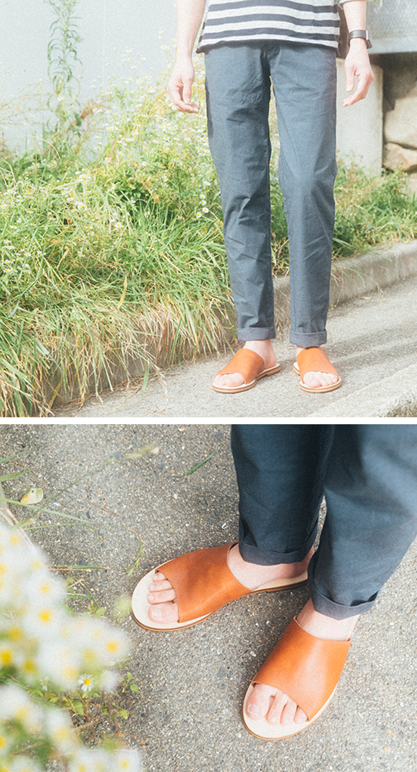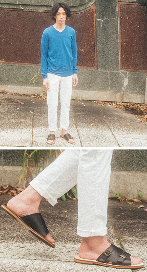 薄手のコットンパンツを少しロールアップして。ラフになりすぎない上品なサンダルスタイル。